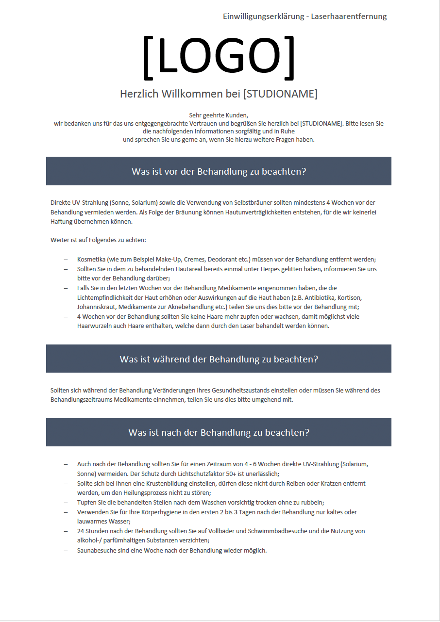 Ideal für Kosmetikstudios, Laserzentren & Praxen – sofort einsetzbar & editierbar (PDF/Word).